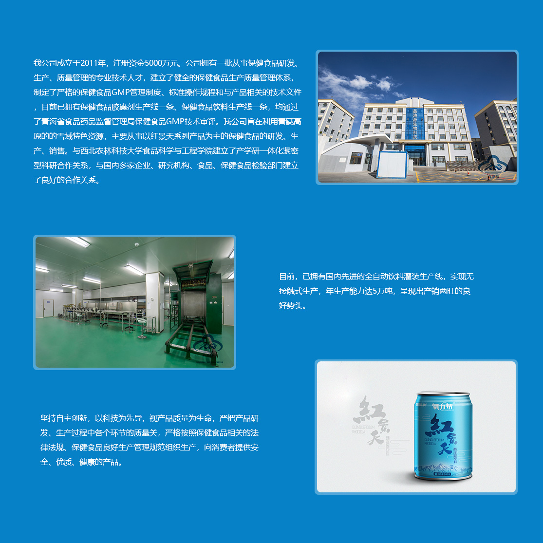 青海鑫池源生物科技開發(fā)有限公司2011年3月29日在青海生物科技產(chǎn)業(yè)園區(qū)工商行政管理分局登記成立,注冊資金5000萬元。         鑫池源公司立足于青海省綠色環(huán)保無污染的高品質(zhì)紅景天資源,以西北農(nóng)林科技大學(xué)食品科學(xué)與工程學(xué)院和青海格拉丹東藥業(yè)有限公司為技術(shù)依托,主要從事紅景天、紅枸杞、黑枸杞等高原生態(tài)植物資源的研究開發(fā)和深加工,產(chǎn)品包括“景胨”牌紅景天西洋參保健飲品、紅景天口服液、紅景天膠囊等系列產(chǎn)品。         公司擁有一批從事保健食品研發(fā)、生產(chǎn)、質(zhì)量管理的專業(yè)技術(shù)人才,建立了健全的保健食品生產(chǎn)質(zhì)量管理體系,制定了嚴(yán)格的保健食品GMP管理制度、標(biāo)準(zhǔn)操作規(guī)程和與產(chǎn)品相關(guān)的技術(shù)文件,目前已擁有保健食品膠囊劑生...